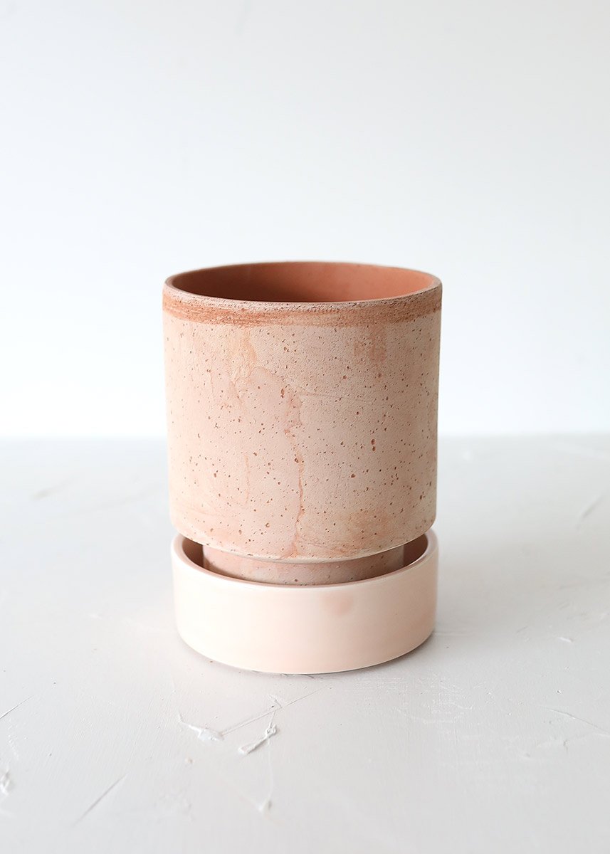 Bergs Potter's pots have been carefully handcrafted to give your live plants the perfect place to grow. Incorporating time-tested techniques and classic design, the Hoff planter is made for your indoor and outdoor gardens. Rough terracotta clay pot with glazed antique pink saucer. Each planter is handmade and will vary slightly.